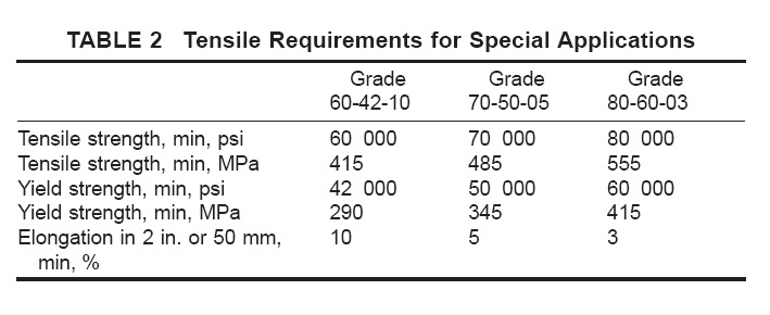 According to the standard of ASTM A536, this material grade requires Tensile Strength min. 485 MPa, Yield Strength min. 345 MPa, Elongation min. 5%.