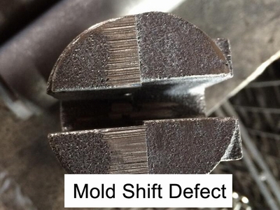 Mold shift is exactly what it sounds like. If the cope and drag of a pattern do not align perfectly, it will produce a defective casting, such as the one pictured right. It is up to the operator to ensure that the cope and drag are aligned perfectly, but there are also ways to help prevent this error.